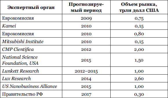 Таблица 2. Прогноз рынка нанотехнологий (разные источники)