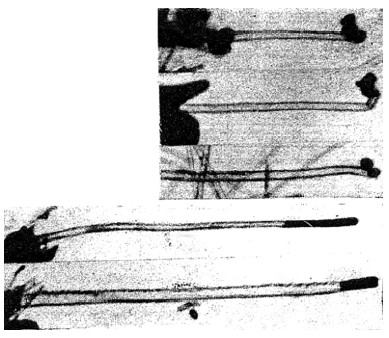 Более того, в научной литературе имеются данные, что аналогичные структуры наблюдались рядом ученых еще в начале 50-х годов прошлого столетия, но детально они изучены не были. Так, в 1952 году в «Журнале физической химии» была опубликована статья сотрудников Института физической химии РАН Леонида Викторовича Радушкевича и Всеволода Михайловича Лукьяновича «О структуре углерода, образующегося при термическом разложении окиси углерода на железном контакте»[4], в которой описаны нитевидные углеродные образования диаметром 50 нм, обнаруженные с использованием электронного микроскопа (рис. 3).