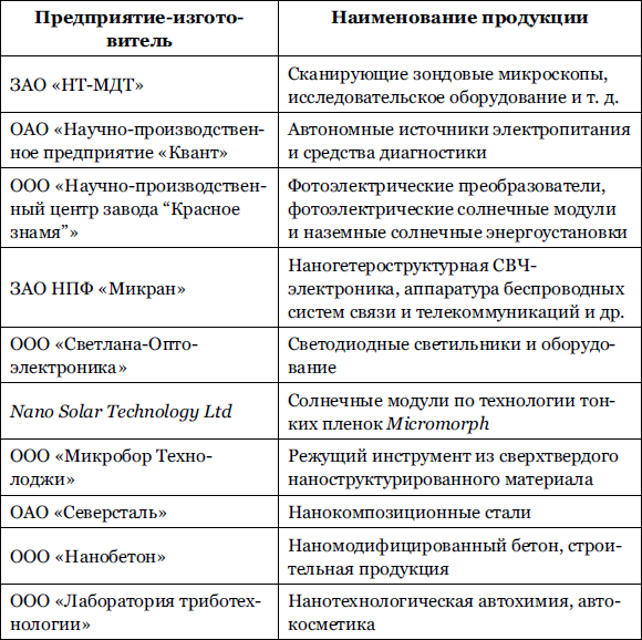 В целом, по планам российского правительства и научной общественности, в 2015 году Российская Федерация в общем объеме должна изготовить продукции с применением нанотехнологий на сумму до 2,5 трлн долларов. Уже сейчас в России работают более 100 предприятий, выпускающих нанотехнологическую продукцию мирового качества (табл. 3).