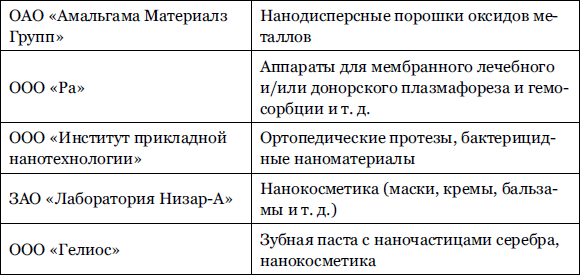 Таблица 3. Некоторые наиболее известные отечественные производители нанотехнологической продукции
