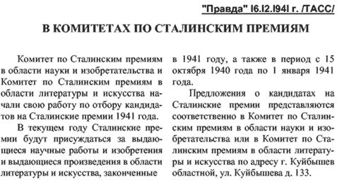 В Совнаркоме СССР «О Сталинских премиях за выдающиеся работы в области науки, изобретательства, литературы и искусства за 1941 г.»