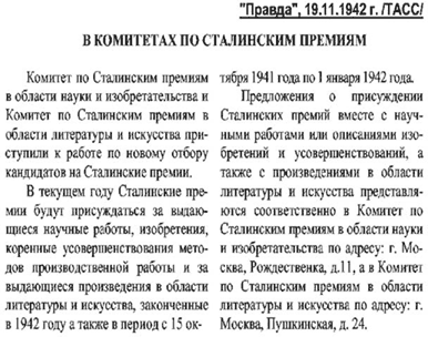 Во исполнение Постановлений Совета Народных Комиссаров СССР от 20 декабря 1939 года и 11 января 1942 года о присуждении Сталинских премий за выдающиеся работы в области искусства и литературы за 1941 год, Совет Народных Комисаров СССР постановляет: