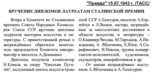 Во исполнение Постановлений Совета Народных Комиссаров СССР От 20 декабря 1939 года и 18 ноября 1942 года о присуждении Сталинских премий за выдающиеся работы в области искусства и литературы за 1942 год, Совет Народных Комиссаров СССР постановляет: