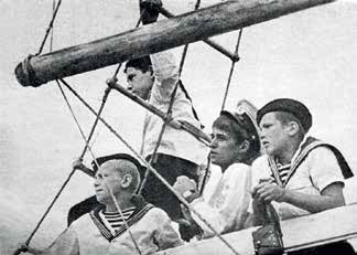 За четыре-пять дней лагерь преображается. Теперь он становится похожим на корабль, скользящий из сосен в воду: столовая стала похожа на верхнюю палубу, ниже – палуба для построений, тут же – каюты-палатки, мачта, командный мостик, два настоящих корабельных орудия на носу, шлюпки и катер у «борта». И уже не разношерстная галдящая ребятня, а юнги в матросской форме готовы к поднятию флага. (Фрэд: «Невозможно заметить, как растет трава. То же самое с воспитанием. Но в эти первые пять дней я отчетливо вижу, как мальчишки растут, меняются на глазах. Самое важное, они и сами это видят и чувствуют. Получая, например, форму, многие первый раз в жизни берут в руки иголку с ниткой – надо что-то подшить, подогнать. Показываем, объясняем. Пыхтят, пот градом, но маленькая победа, одержанная в таком простом деле, ценится высоко. Я слышал несколько раз, как говорят приехавшим в лагерь родителям: «Мама, я это сам сделал».)