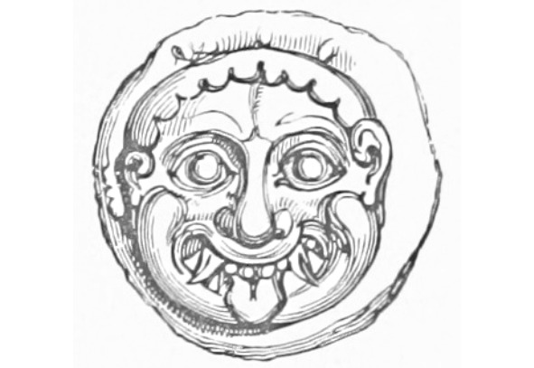 Мы все привыкли к поздним изображениям Медузы Горгоны в виде красивой девушки со змеями на голове, такое изображение даже стало символом модного дома Версаче. У древней же Горгоны – широкое лицо, язык, высунутый из ухмыляющегося рта, клыки кабана и мелкие кудряшки, не очень похожие на змей. Иногда изображения Горгоны делят на египетские и греческие. У египетской Горгоны – волосы-змеи, крылья на голове и красивое, задумчивое лицо, означающее божественную мудрость. У греческой Горгоны лицо искажено гневом или болью, так как она олицетворяет божественную ярость по отношению к врагам14. Высунутый язык некоторые исследователи считают символическим языком лавы вулкана. Эзотерики считают, что изображение Горгоны будило самые древние, врожденные страхи человека, не давая совершать плохое. Есть мнение, что ее образ копирует изображения мертвого человека с изуродованными чертами лица и высунутым языком.