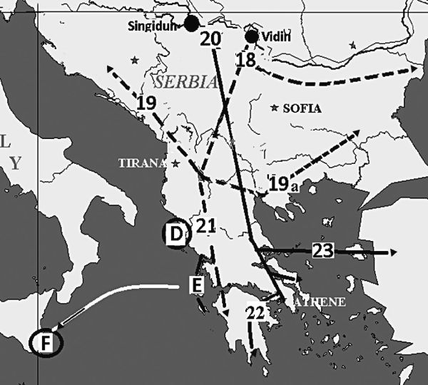 В VII–VIII веках продолжается расселение на Балканах. Согласно болгарским сказаниям, из Олтении и Мунтении переправа через Дунай происходила через город Бдына (современный Видин) в ромейской Бононии [5]. На другом берегу поток разделялся на два. Главный направился в Охрид, где уже с VI века присутствовали славяне, другой – вниз по Дунаю (М18). В него входили северы, возглавившие союз семи родов. Из перенаселенного Охрида в 614–615 годах следуют волны нашествий от юга Иллирика до Ахайи. Одно направление двинулось на Старый Эпир, а также Превалитанию и Далмацию (М19), другое – на Фессалоники, откуда развернулась во Фракию (М19а). Словене Потисья и Поморавья вместе с семьями расселились в Македонии, а потом переместились в Фессалию (М20). Юг Македонии заняли дреговичи, юго-запад – сагудаты, а внутренние области – берзичи. В Лаконии обосновались милинги и езеричи, в Фессалии велездичи, в Старом Эпире войничи. В результате оказались полностью захвачены Фессалия, Ахайя, Старый Эпир. Вновь были разорены Афины и Коринф. По восточному побережью словене вторглись в Пелоппонес и Лаконию, где уже с 580 года находились их собратья. Пражская керамика, относящаяся к этому периоду, встречается в Греции уже весьма редко.