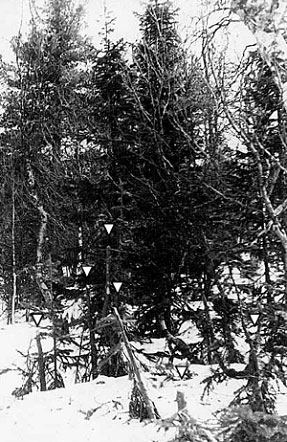 The place called “cut fir woods”: cut firs’ tops (marked by five triangles). In the background one can be seen two cedars where the victims have been found