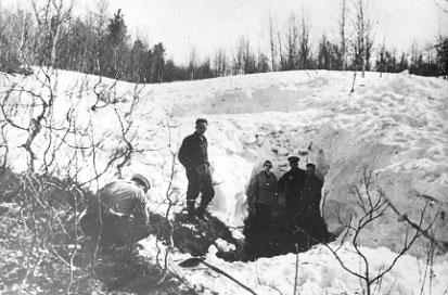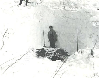Finally due to the snow melting separate pieces of clothes have been discovered from under the snow (Krivonishenko's burned trousers and a jacket). As well as scrapings of firs branches and its needles let the rescuers define a proper direction of search. They led them into a stream hollow approximately 70 m from a cedar. The hollow has been strongly snowed under so it was necessary to lengthen avalanche probes to 3 m. Only after that it became possible to seize the new findings under snow 15 m from discovered earlier pieces of clothes. The excavation of the suspicious places allowed rescuers at a depth of 3 m to detect flooring consisted of 14 trunks of small firs and one birch 2 m in length. There were fir twigs and some pieces of clothes on the flooring. According to A.G. Mokhov the positions of these objects on the flooring showed four spots which have been made like «seats» for four persons. The missing tourists haven’t been found there. A new riddle they had! But the searchers were close to succeed.