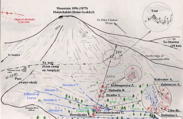 The positions of victims on the slope of 1096 Kholatchal mountain