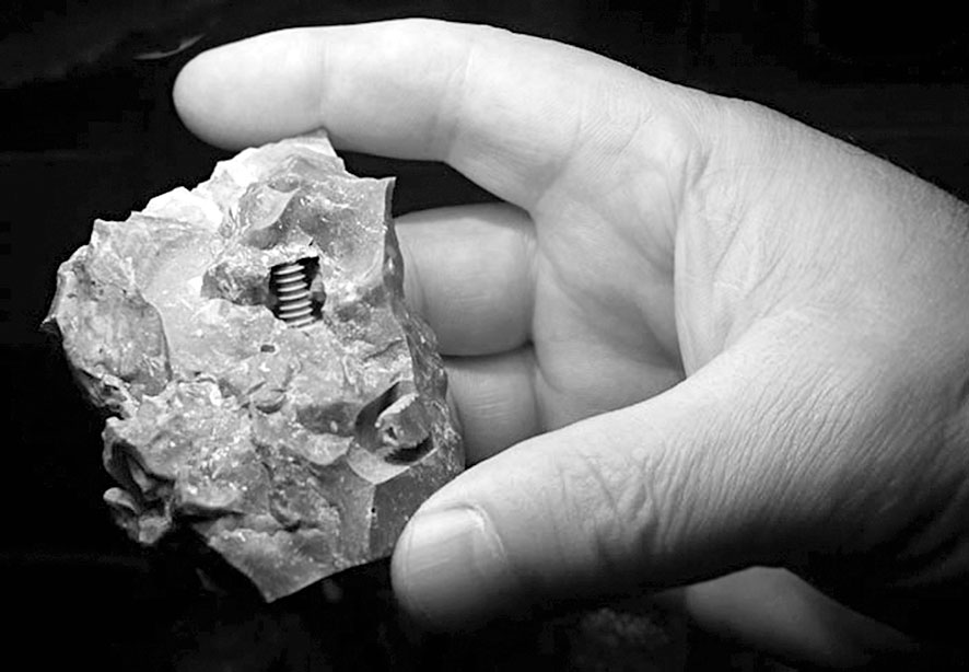 А теперь сошлюсь на нашего современника, многие годы занимающегося тайнами аномальных явлений и НЛО. Для этой цели он в 1980-м году, будучи студентом аэрокосмического факультета Московского авиационного института (МАИ) даже создал проект «Космопоиск», и стал одним из ведущих специалистов в этой области познания. Это Вадим Чернобров, ученый-исследователь, поисковик, ищущий истину не в тиши академических кабинетов, а на бескрайних просторах Родины, и сам уже ставший автором популярных книг. Приведу лишь одно событие, участником которого он был и о чем засвидетельствовал. Это происходило летом 1998 года, когда экспедиция Центра «МАИ-Космопоиск» занималась поисками осколков метеорита на юго-западе Калужской области. «…Дмитрий Курков привычным уже движением поднял с земли камень и поначалу мельком осмотрел его. Затем для подстраховки дал осмотреть его оказавшейся поблизости Лиле Кулешовой. Та смахнула прилипшую к камню грязь и… Прямо на сколе слоистого кремневого камня был ясно виден каким-то образом попавший внутрь… обыкновенный болтик длиной около сантиметра. Как он оказался в камне? ‹…› …попал внутрь камня еще в те времена, когда тот был всего лишь осадочной породой, донной глиной. …по заключению нашего специалиста-геолога, камень этот не может быть моложе 15–20 миллионов лет! Значит? ‹…› / С тех пор камень (и я с ним) побывал в палеонтологическом, зоологическом, физико-техническом, авиационно-технологическом институтах, в палеонтологическом и биологическом музеях, в лабораториях КБ “Салют”, “ЗиХа”, “Геохи”, “Геологоразведка”, МАИ, МГУ, а также еще у нескольких десятков специалистов в самых различных областях знаний.