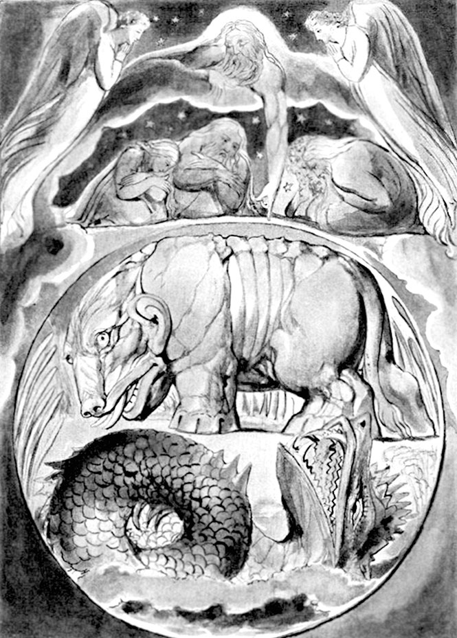 Примером может служить картина «Бегемот и Левиафан» английского художника Уильяма Блейка. Блейк (1757–1827), английский поэт, живописец, гравер; иллюстрировал акварелями и гравюрами собственные стихи («Песни неведения» 1789, «Песни познания» 1794, «Книгу Иова» 1818–1825, «Божественную комедию» Данте 1825–1827 и др.). Любопытно, что одной из работ его стал именно библейский бегемот, коего Иову показывал сам Господь, распространяясь о своем могуществе в умении создавать исполинов животного мира.