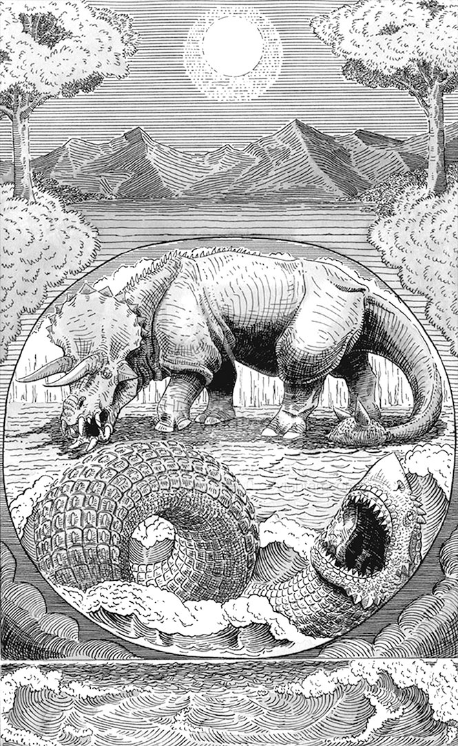 А вот куда, в какой мир заглянул великий живописец, опередивший свое время лет на сто, – об этом мы поговорим в других главах книги. Одним из тех, с кем имел дело творец, был библейский Левиафан. Тот, о котором говорит Господь с Иовом после того, как рассказал о бегемоте. «Можешь ли ты удою вытащить Левиафана и веревкою схватить за язык его? Вденешь ли кольцо в ноздри его? ‹…› Кто может открыть верх одежды его, кто подойдет к двойным челюстям его? (а теперь вспомните находки о странных черепах с двойным рядом зубов, обнаруженные на Аляске, в Африке и др. – авт.) Из пасти его выходят пламенники, выскакивают огненные искры. Из ноздрей его выходит дым, как из кипящего горшка или котла. Дыхание его раскаляет угли, и из пасти его выходит пламя. На шее его обитает сила, и перед ним бежит ужас». Библия, Книга Иова 40: 20–21; 41: 5,11–14.