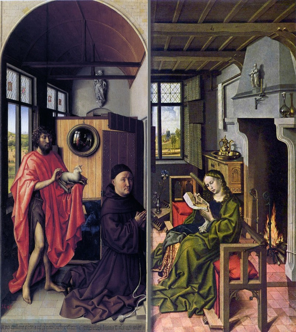 Он стал четче прорисовывать тени, поэтому взаиморасположение предметов утратило плосковатую наивность, пространство теперь кажется организованным намного гармоничное. Еще в комнате появилось то, что можно было бы назвать намеком на световоздушную среду. Кампен все дальше и дальше уходит от готической книжной миниатюры.