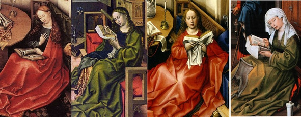 Позы девушек практически идентичны. А ведь это разные героини, написанные в разное время и даже разными авторами! (слева направо): 1) Мария, «Благовещение». Возможно, это Кампен, но многие искусствоведы приписывают работу Жаку Даре; 2) Святая Вероника с Верльского алтаря. Кампен; 3) Мария с Меродского алтаря, Кампен; 4) Мария Магдалина с полиптиха Рогира ван дер Вейдена