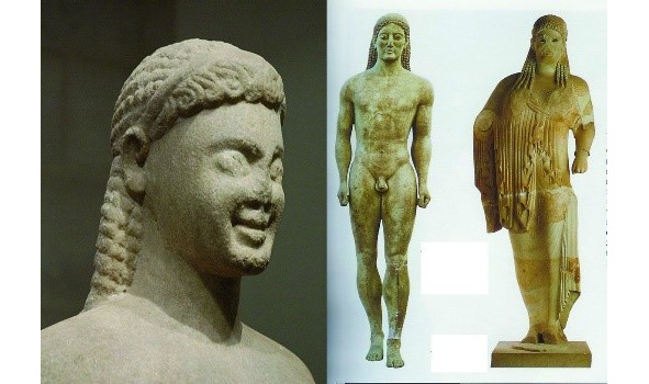 В прошлый раз мы с вами говорили о том, что историки давным-давно отмечают несколько периодов в истории культуры. И это правильно. Первый период, о котором мало что осталось – это период догомеровский или период троянских войн, но по нашему понятию он, действительно, догреческий. Это совсем другая культурная идея. Затем гомеровский период, от которого тоже мало что дошло, как бы то, с чего учитывается или то, с чего все начинается. Они называются «античной архаикой». А мы с вами говорили, что архаика связана с малоазийской Грецией и центр этого периода находится в городе Милет. Можете сразу выделить глазом. Предмет изображения тот же. Юноша, молодой человек, обнаженный, но с несколько иным этническим типом. Кроме этих, таких пучеглазых молодых людей.., а чего вы смеетесь?