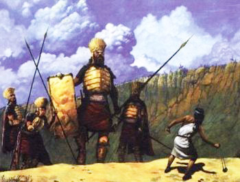 Затем произошла памятная стычка с филистимлянами. Оба войска стояли друг против друга, не решаясь напасть. Тогда из стана филистимлян выступил великан Голиаф, предложив евреям помериться силами в поединке. Сорок дней кряду Голиаф выходил перед своим войском и смеялся над евреями. Никто не мог даже пискнуть что-нибудь против него. Царь Саул обещал большую награду тому, кто победит Голиафа, но смельчаков не находилось.