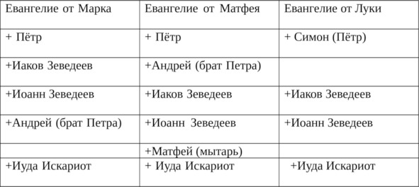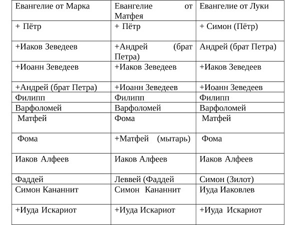 Вернёмся же к спискам апостолов, сравним их и обозначим знаком + (плюс) имена тех из них, которые упоминаются в каждом из этих Евангелий ещё хотя бы раз.