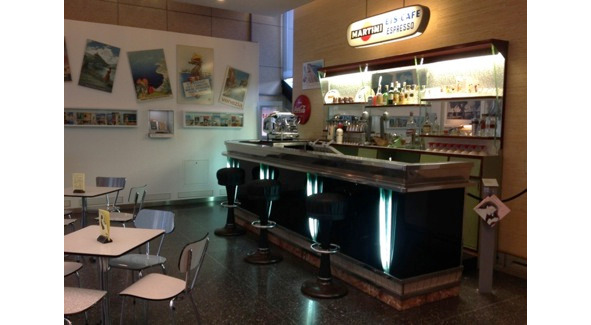 Продолжая тему повседневности, отмечу то, что потребительское общество Западной Германии показано через реконструкцию отдельных помещений – кинотеатра, кафе, квартиры того времени. Вот, например, придорожное кафе-бар 1960-х гг., воссозданное так, будто посетитель находится в то время. Каждый может подойти, потрогать, сфотографироваться и даже послушать песни того времени на проигрывателе тех лет.