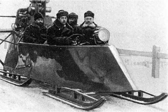 Первые российские аэросани. На переднем плане Игорь Сикорский и М. В. Шидловский, Киев, зима 1912 года