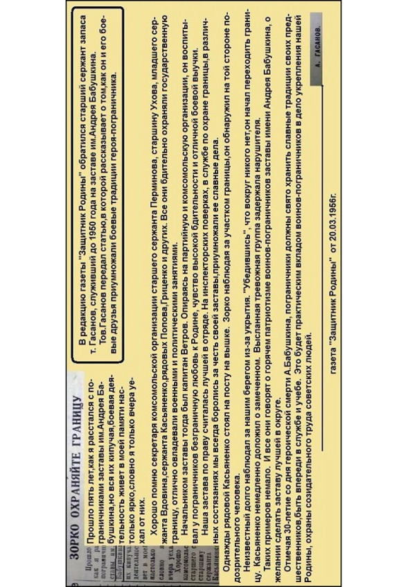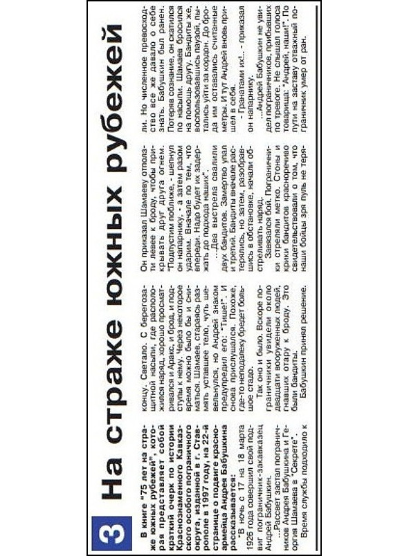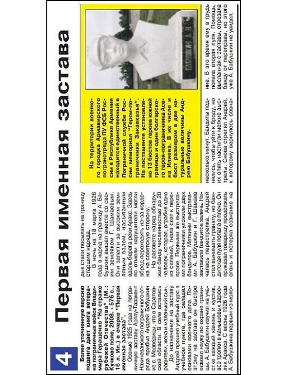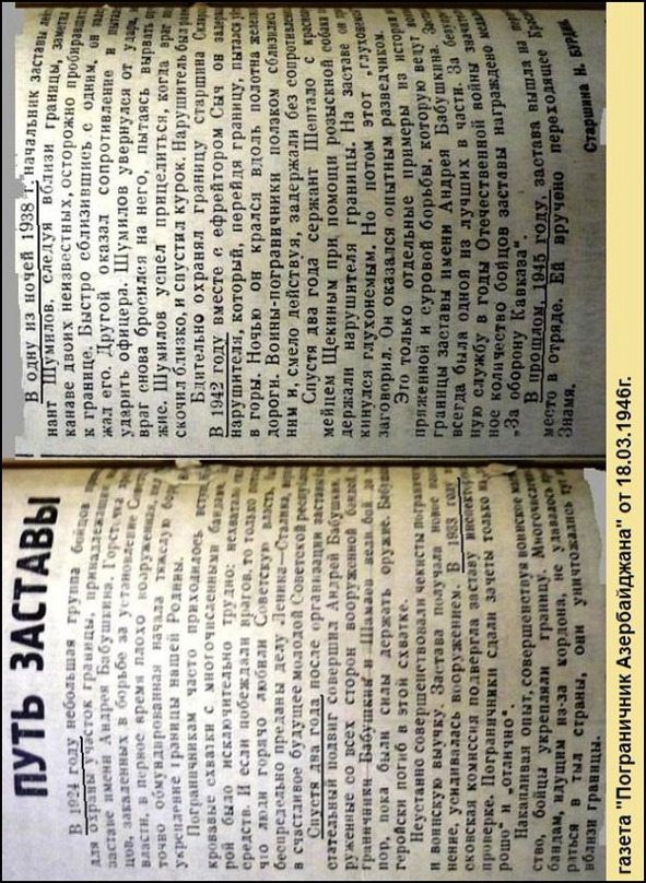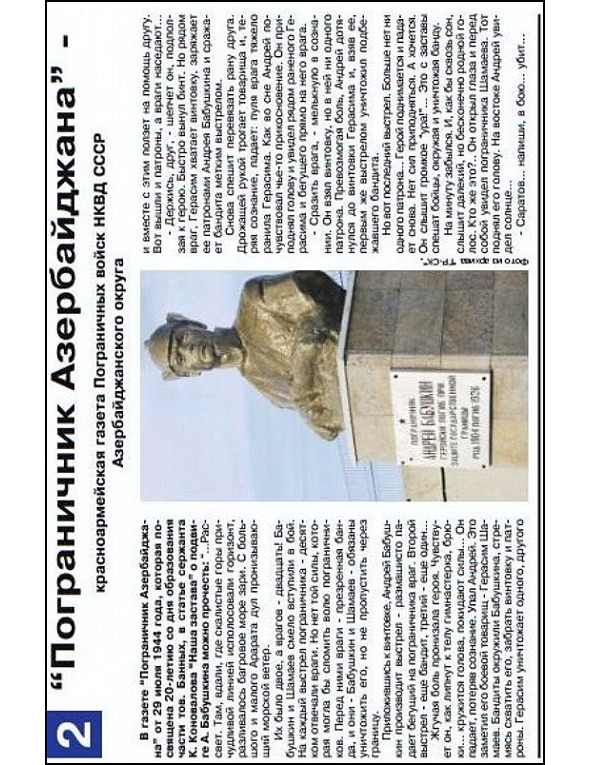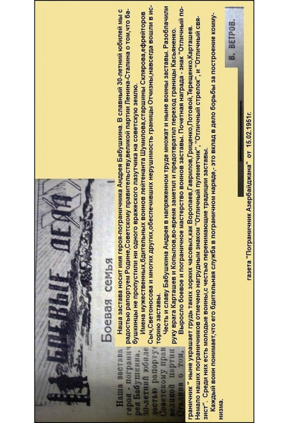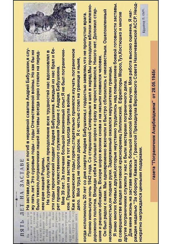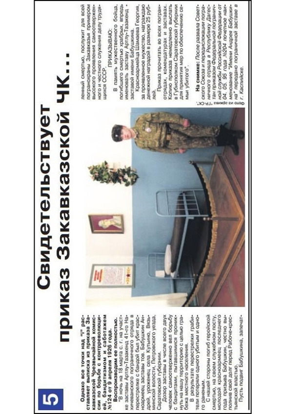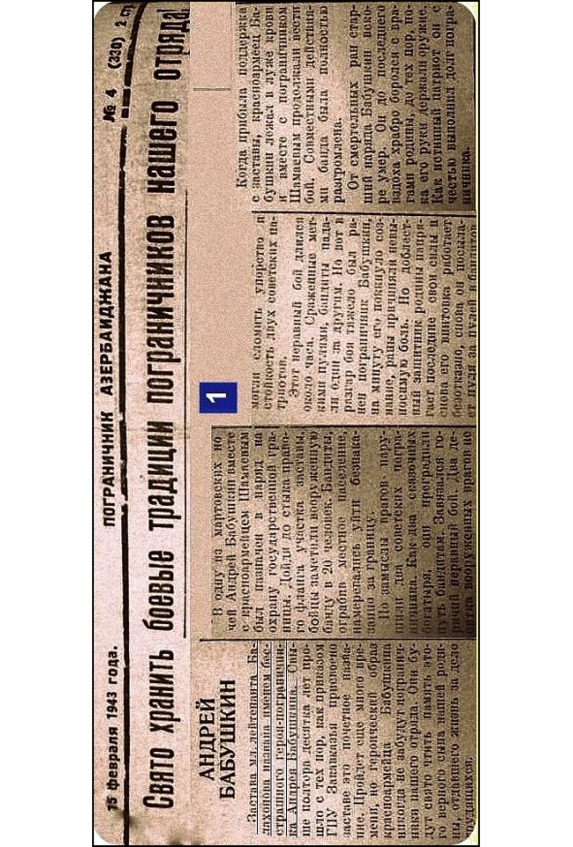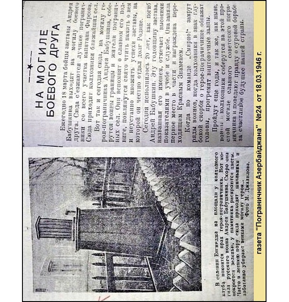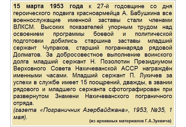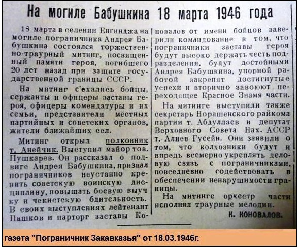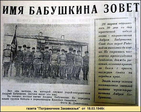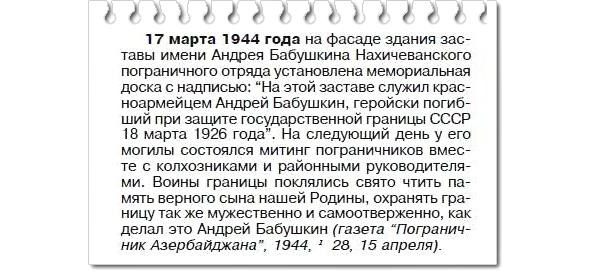 18 марта 1926 года в бою с бандгруппой, пытавшейся проникнуть на нашу территорию с целью грабежа местного населения, геройски погиб А. М. Бабушкин, красноармеец заставы Артлу-Тазакенд 41-го Нахичеванского отряда Закавказского округа пограничной охраны (так изложено в Документальном фонде Центрального пограничного музея, п. 11, д. 7.).
