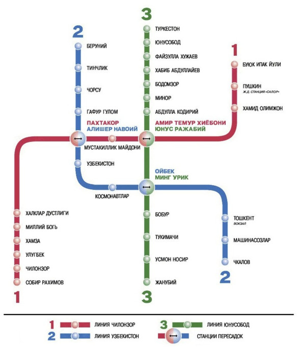 Метро в Ташкенте строилось с учётом высокой сейсмичности региона. В настоящее время здесь работают три линии, которые очень легко различать по цвету. Чиланзарская линия – первая, и она, как и в Москве, красного цвета. Узбекистанская вторая (открыта в 1984 году) – синяя. Юнусабадская – третья – зеленая (она была открыта в постсоветский период в 2001 году). Протяжённость трёх линий метро с 29 станциями составляет 36,2 км.
