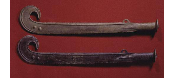 Во время ирригации земельного участка в в Рорби, западной части Зеландии в 1952 году Торвальд Нильсен обнаружил изогнутый меч из бронзы, покрытый древними изображениями. Меч был датирован началом бронзового века, (около 1600 г. до н.э.), и был в то время первым таким мечом найденным в Дании. Торвальд Дженсен спустя пять лет о в том же самом месте, во время работ на огороде выкопал случайно еще один изогнутый меч. Найденный меч, так же как и первый был покрыт узором, и там было изображение древнего судна с двумя штевнями. Это самое древнее изображения корабля в Скандинавии. Так же это самые древние мечи из металла обнаруженные в современной Скандинавии. Но нельзя назвать эти артефакты оружием, они не были никогда заточены. Такого же типа меч у хеттов, народа в Малой Азии, имелся так же. Судя по изображениям на барельефах, в ритуальных целях носились подобные мечи как властителями хеттов, так и божествами, по книге О. Генри «Хетты» стр 201.