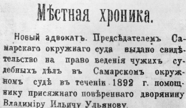 Так В. И. Ульянов стал частным поверенным13. Соответствующая информация в газете «Самарские губернские ведомости» была опубликована 5 августа 1892 г.