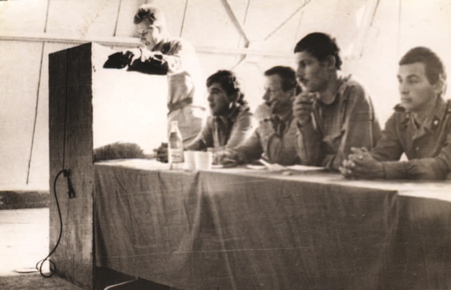 Комсомольский актив бригады 1981 г. Выступает секретарь комитета ВЛКСМ 1 мсб Тихонов А. В президиуме: начальник политотдела бригады Плиев Р. С. и комбриг Шатин М. В.