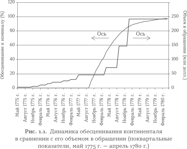Война за независимость оставила хрупкую американскую экономику в руинах. Сражавшиеся армии уничтожали города и фермерские усадьбы. Британские военные корабли остановили морскую торговлю. Более 25 000 американцев погибли в боях. Континентальный конгресс пытался профинансировать войну, запустив на всю катушку печатный станок – не обеспеченных ничем ассигнаций-«континенталей»[71] было напечатано на 242 млн долл. Поначалу это сработало, позволив Джорджу Вашингтону снабдить армию провизией и амуницией, но постепенно привело к гиперинфляции. К 1780 г. континентали торговались за одну сороковую их номинальной стоимости (отсюда и выражение «не стоит и континенталя»), и правительству пришлось изъять их из обращения. Таким образом, эта новая национальная валюта исполнила роль скрытого налога на обычных – а еще в большей степени на богатых – американцев. Те, кто перевел свои сбережения в континентали, дешевевшие все сильнее, фактически были вынуждены оплатить значительную долю военных расходов правительства (см. рис. 1.1).