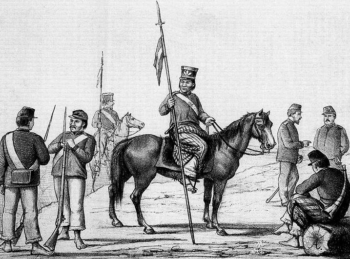 Обмундирование парагвайских пехотинцев и кавалеристов середины 1860-х годов. Солдаты всех родов войск носили красные рубахи навыпуск и штаны из беленого полотна. Зачастую вместо штанов либо в дополнение к ним надевали традиционные набедренные повязки индейцев-гуарани из плотной полосатой ткани, иногда – с бахромой. В качестве головных уборов применялись черные кожаные кивера-шако, опоясанные лентой цветов национального флага, реже – матерчатые кепи. Обувь в тогдашней парагвайской армии полагалась только офицерам
