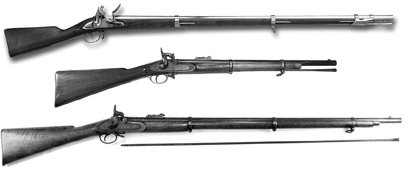 Стрелковое оружие парагвайских солдат времен Великой войны. Сверху вниз: кремневый мушкет «Браун Бесс», капсюльный кавалерийский карабин «Энфильд» и капсюльное пехотное ружье той же фирмы