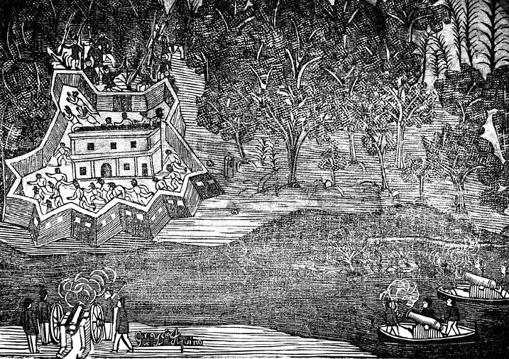 Гравюра из парагвайской газеты «Семинарио» с изображением обстрела форта Коимбра. Справа видны артиллерийские баржи-чатас, но их размеры – весьма условны. Внутри форта паникуют бразильцы, причем всех их автор изобразил неграми. Это характерный расистский момент парагвайской военной пропаганды, которая постоянно твердила о том, что в бразильской армии рядовыми воюют «черные макаки», а белые только ими командуют. На самом деле чернокожие солдаты составляли примерно треть рядового состава бразильской армии