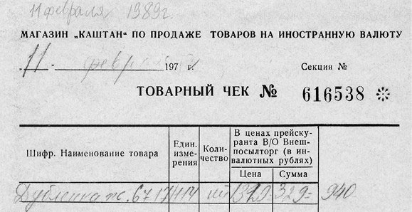 Товарный чек из валютного магазина «Каштан» в Харькове. 1989. Фото предоставлено М. Истоминым