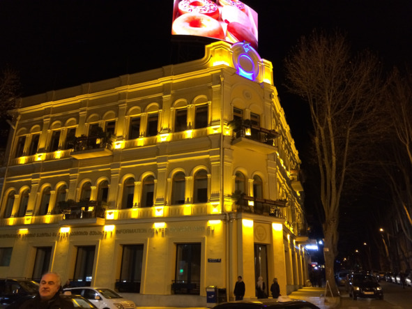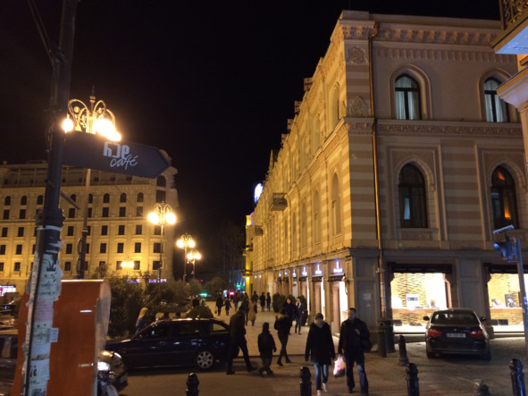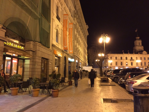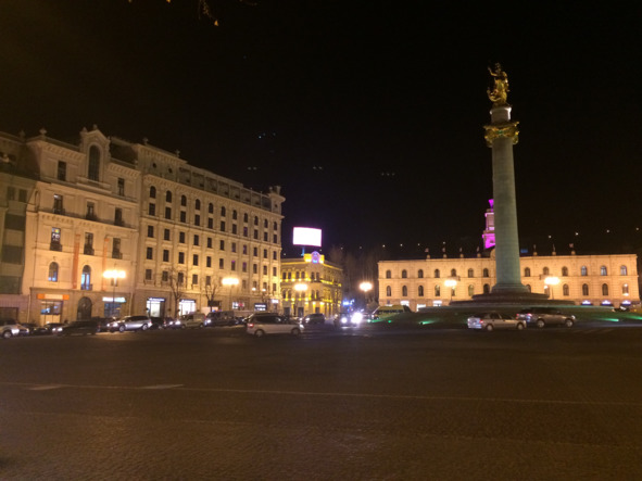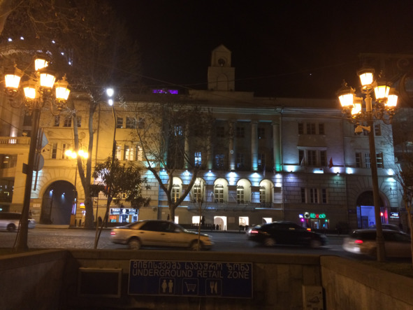 Поскольку площадь, подробнее об истории которой я Вам еще расскажу, имеет важное идеологическое значений для современной Грузии, все здания здесь новые, либо отреставрированные, и в вечернее время все они освещаются яркими прожекторами.