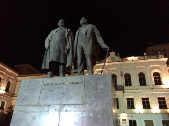 Памятник Акакию Церетели и Илье Чавчавадзе на проспекте Шота Руставели возле здания школы №1