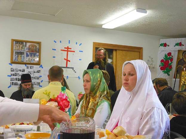 В просторном светлом зале собралось несколько десятков человек, русских, и нам в основном незнакомых. Но и здесь почти все одеты были и выглядели как настоящие староверы: бороды, косынки, тканые пояса…