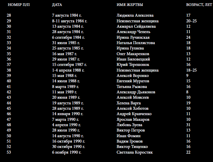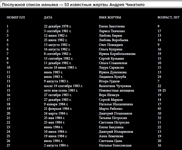 Смерть Ларисы Ткаченко, по сути, и стала началом кровавого пути Андрея Чикатило. В 1982 году он убил семь человек, на следующий год – еще восемь. В 1984-м маньяк совершил 15 убийств. Большинство жертв были очень юны, от семи лет (самой юной жертвой в 1983 году стал Игорь Гудков) до старшего школьного возраста. Но он отправил на тот свет и много женщин в возрасте от 20 до 40 и выше. Самой старшей жертвой Чикатило стала 45-летняя Марта Рябенко, убитая 21 февраля 1984 года в парке Авиаторов в Ростове.