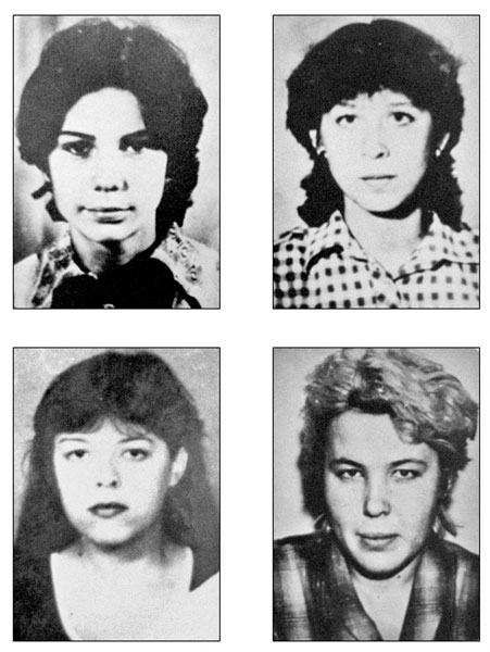 Портреты четырех молодых женщин, убитых Андреем Чикатило. Жертвами становились почти исключительно женщины, девочки или мальчики. Взрослыми мужчинами маньяк не интересовался.