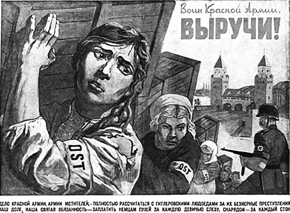 Плакат, призывающий воинов Красной армии освободить из неволи женщин, угнанных на работу в Германию.