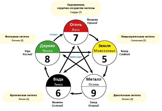 Со временем практически каждый аспект жизни получил интерпретацию в свете теории пяти элементов. Каждому элементу стали соответствовать определенное время года, цвет, сторона света, запах, число, внутренние органы и т. д. Смена времен года отражает взаимозависимость пяти элементов; весной доминирует дерево, которое рождает огонь – летний элемент. Огонь рождает землю, которая является характеристикой центра – третьего летнего месяца. Земля, в свою очередь, рождает металл – доминирующий осенний элемент, а металл порождает воду зимы.