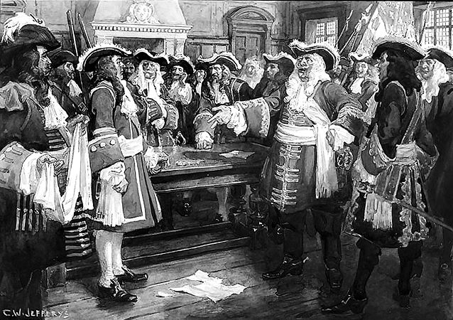 Граф де Фронтенак принимает британского посланникаУильяма Фипса с требованием о капитуляции Квебека. Худ. Чарльз Уильям Джефрис (1925)