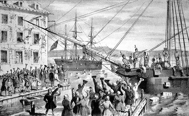 Уничтожение чая в Бостонской гавани. Литография 1846 года