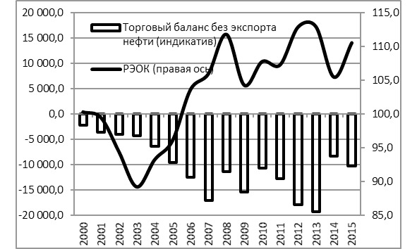 Ниже приведена динамика индекса РЭОК (реального эффективного обменного курса) (правая ось) и дефицита ненефтяного торгового баланса.