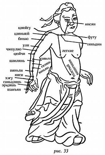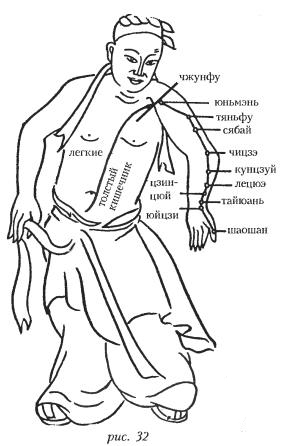 Меридиан начинается в «среднем обогревателе», огибает толстый кишечник, проходит вокруг верхнего отверстия желудка, пронизывает диафрагму и входит в легкие. Затем из легких меридиан выходит на поверхность в районе точек чжунфу и юньмэнь, по внутренней стороне руки опускается до ручного цзюэ-инь меридиана перикарда, через точки тяньфу и сябай тянется до точки чицзэ, находящейся на складках кожи на внутреннем сгибе локтя. Далее по предплечью через точки кунцзуй, лэцюэ, цзинцюй (на месте пульса) и тайюань входит в область основания большого пальца, проходит по ее внешней стороне, через точку юйцзи входит в большой палец, проходит через точку шаошан и достигает кончика большого пальца (рис. 32). Меридиан оказывает влияние при кашле, одышке, распирании грудной клетки, сухости во рту, боли в плечах и спине, раздражительности, опухоли в горле.