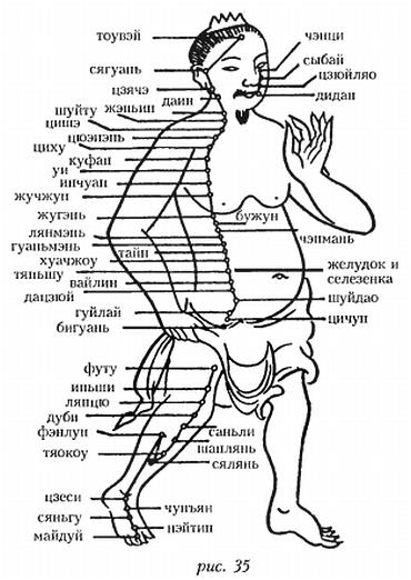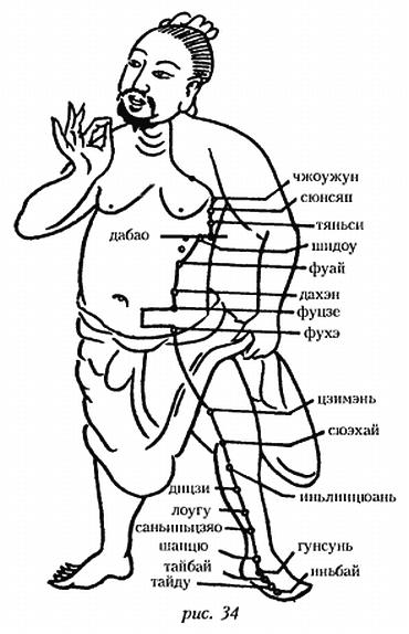 Меридиан начинается на кончике большого пальца ноги, идет по ее внутренней стороне через точки иньбай, тайду, тайбай, гунсунь и шанцю, пересекает передний край лодыжки и далее тянется по внутренней стороне голени через точки саньиньцзяо, лоугу, дицзи, иньлинцюань. Затем меридиан (рис. 34) продолжает подниматься по передней внутренней стороне колена и бедра через точки сюэхай, цзимэнь, чунмэнь и входит в живот, где соединяется с селезенкой, желудком и далее, пронизывая диафрагму, доходит до основания языка. Меридиан оказывает влияние при боли в желудке, вздутии живота, воспалении кишечника, рвоте, отечности, тяжести в теле, затрудненности мочеиспускания.