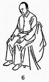 3) Положение сидя. Сядьте на стул, корпус держите прямо. Ноги свободно разведите на ширину плеч, колени согните под углом 90°. Естественно, что для правильного принятия позы следует подобрать стул соответствующей высоты. Голову немного наклоните вперед, вберите грудь, расслабьте плечи, локти свободно опустите, кисти положите на колени. Ни в коем случае не облокачивайтесь на спинку стула, чтобы не потерять состояние расслабления (рис. 6).