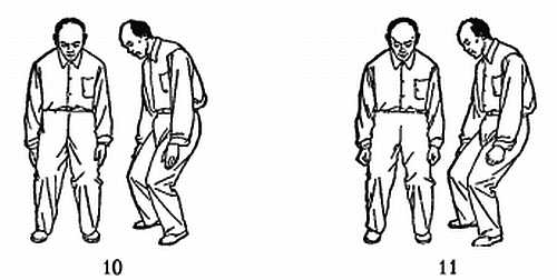 2) Дыхание с «ведением и привлечением ци». Применяется на втором этапе. В начале занятия «выводите» ци в направлении точки хуэйинь (область промежности). Одновременно с «выведением» медленно приседайте до тех пор, пока в коленях не почувствуете легкую ломоту. Мысленно «ведите и направляйте» ци из даньтяня в бедра, колени, голени, в центральные точки ступней ног. Во время вдоха вновь возвращайте ци от ступней через хуэйинь в даньтянь. Затем повторите все еще раз.