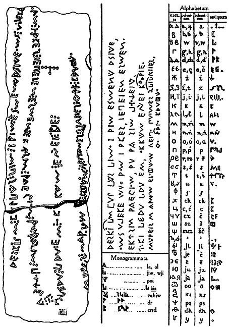 Эт-русская азбука показывает соответствие эт-русских букв с привычной нам кириллицей, польскими и богемскими буквами. Существовали в эт-русском алфавите и сложные буквы, представляющие собой сочетания нескольких букв. Кстати, в кириллице тоже были сложные буквы: «я» = «иа», «ю» = «иу», «кси», «пси» и т. д.