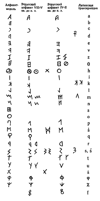 Как сообщает А.И. Немировский, «в Эпоху Возрождения… все надписи Италии, графически отличающиеся от латинских, считались этрусскими». В дальнейшем этрускология «продвинулась вперед», не расшифровав при этом ни единой эт-русской надписи. Сегодня этрускологи делят непонятные им надписи, найденные в Италии, на эт-русские и еще какие-то другие. Мы не будем здесь излагать тонкости этой классификации, а останемся для простоты понимания на изначальной точке зрения эпохи Возрождения.