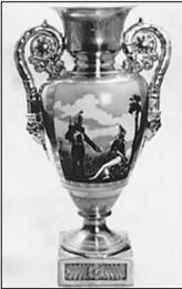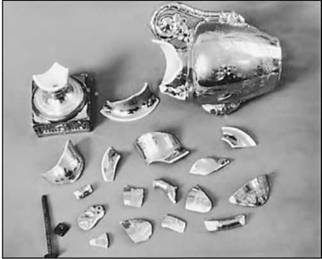 Фарфоровая ваза с изображением унтер-офицера и рядового была выполнена в начале 1830-х гг. на заводе С. Батенина в Санкт-Петербурге. Вид до и после реставрации. Реставратор Л. В. Дмитренко склеила фрагменты с помощью эпоксидной смолы и восполнила утраты.